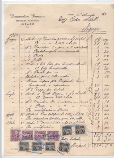 Come riporta la fattura allegata nel 1940 Brusamolino Francesco (il nonno) già operava nel settore degli impianti elettrici (negozio in via San Rocco ad Inzago). Il testimone poi è passato ad Erminio ed infine a noi Roberto ed Adolfo. Negli anni ci siamo specializzati in impianti industriali MT/BT, civili, terziario sino a tecnologie di PLC e Domotica.